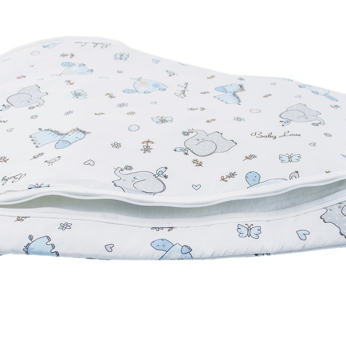 - Чувалчето се закопчава с цип, който е поставен така, че да не причинява дискомфорт на детето при завъртане в креватчето. В края завършва с предпазител за брадичката.