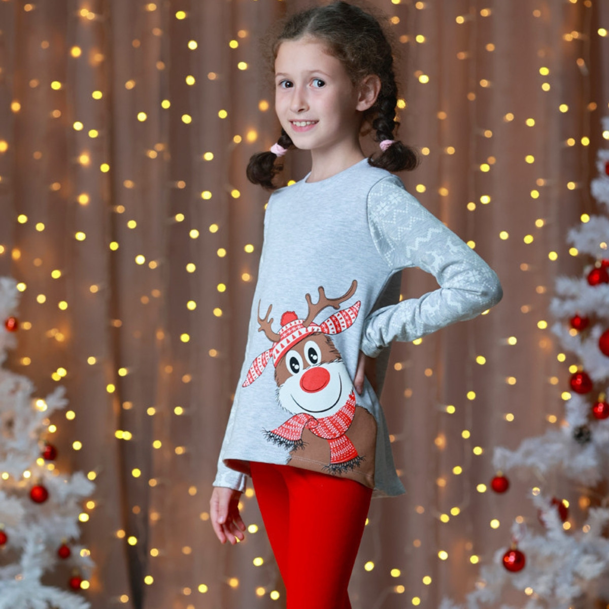 - Тунката е в сив меланж с шампирани коледни елементи отпред и на ръкавите