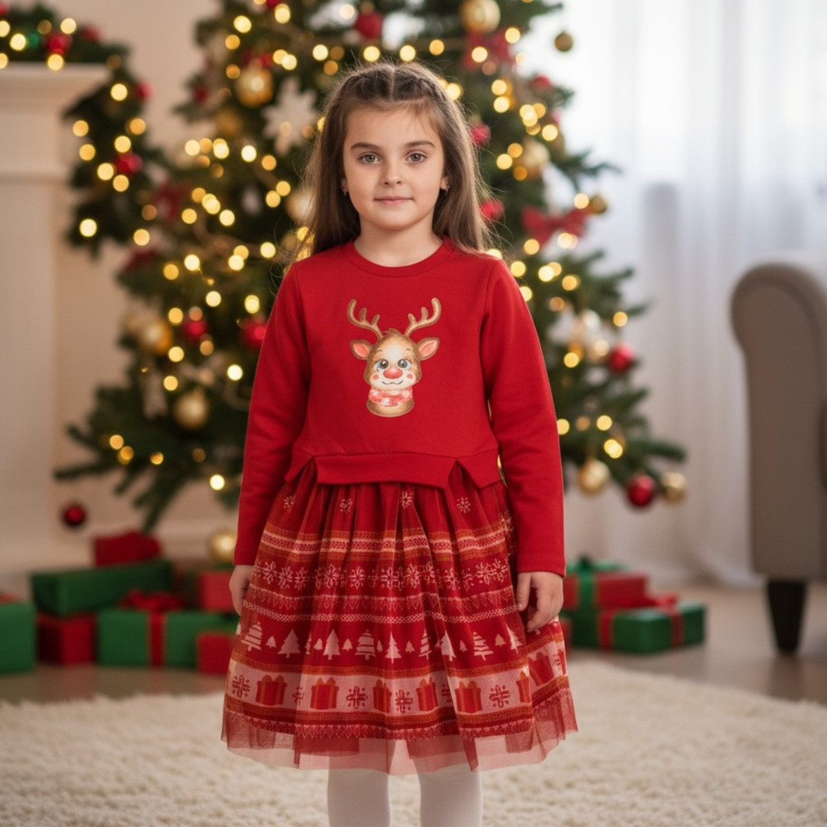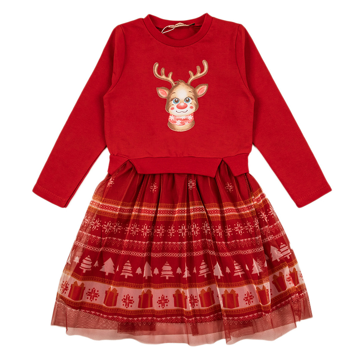 - От талията се спуска пласт тюл, украсен с принтитани коледни елементи.