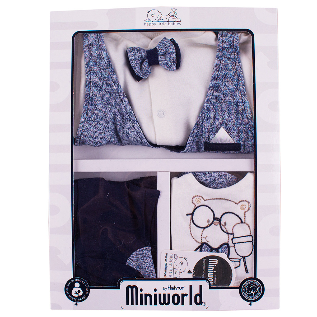 - Състои се от 5 части: жилетка с тик-так закопчаване и пришита папийонка, елек с имитация на джобче, ританки в черно с тигел отпред, ръкавички, каскет и лигавник