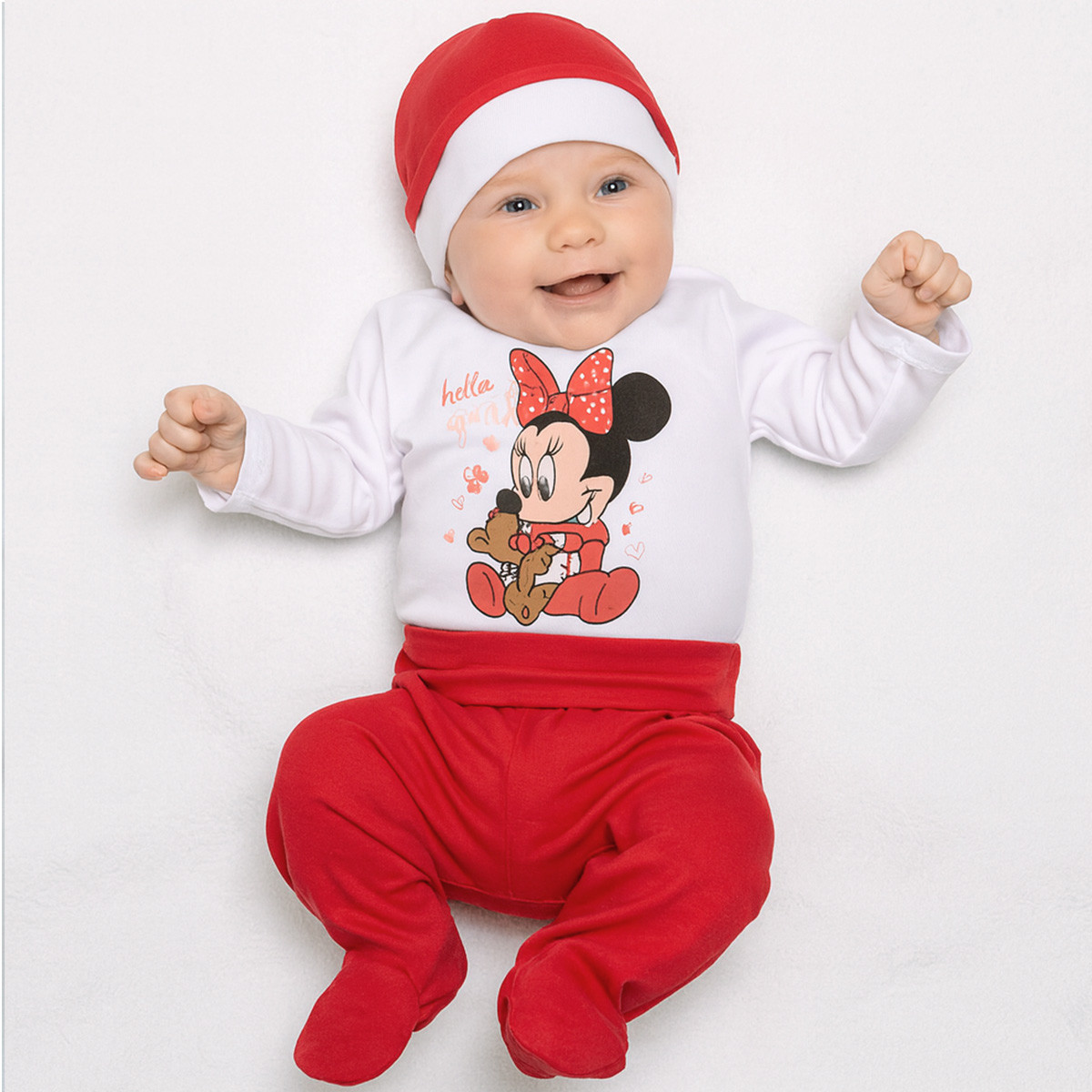- Комплектът се състои от: боди с дълъг ръкав, ританки и шапка.