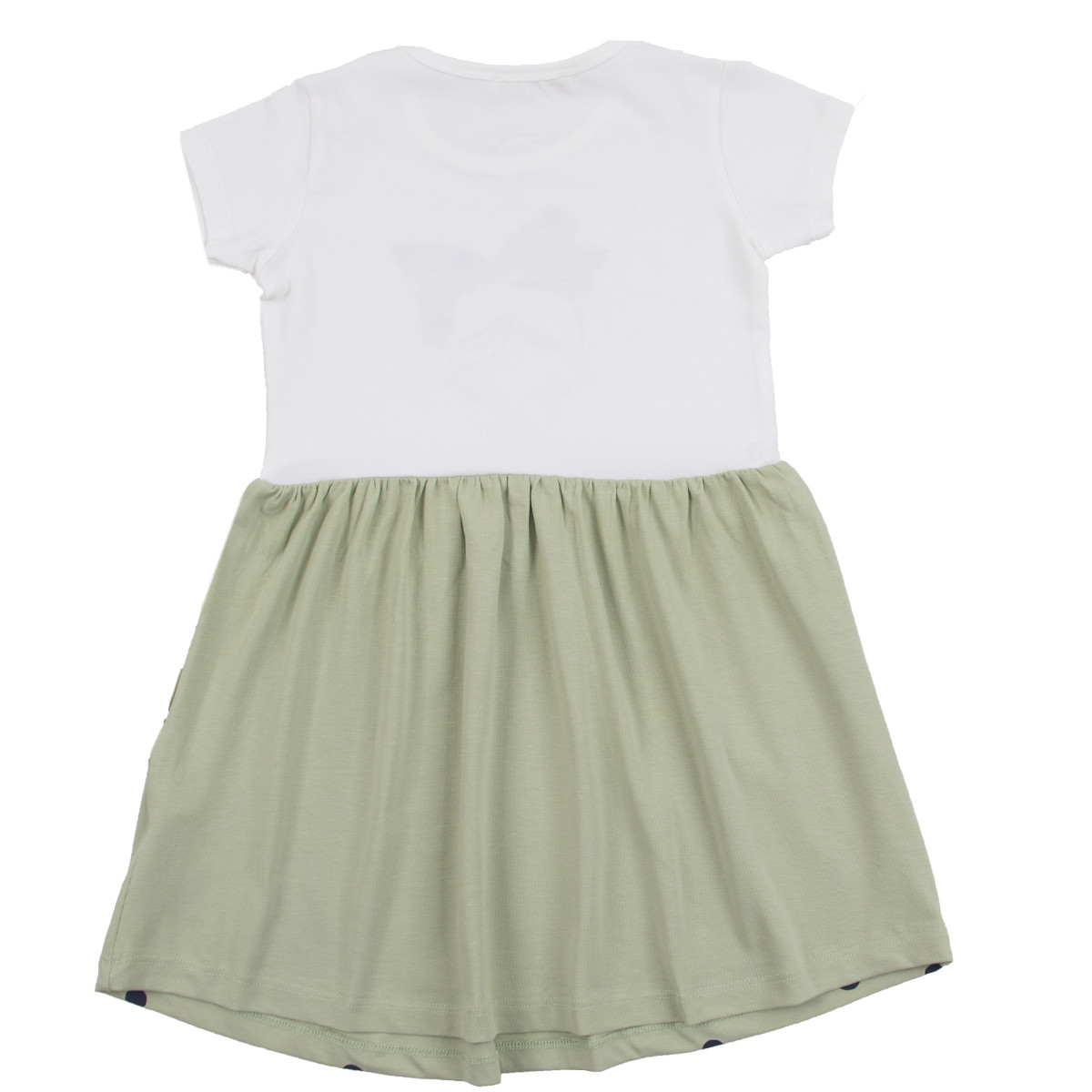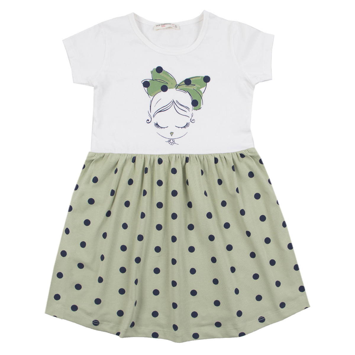 - Горната част е с щампирана картинка отпред, а полата е обсипана с точки.