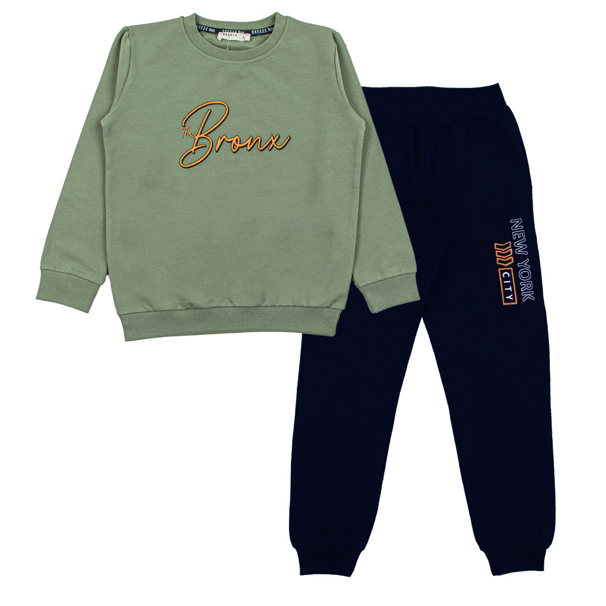- Долнището е тъмносиньо с два функционални джоба и надпис на крачола.
