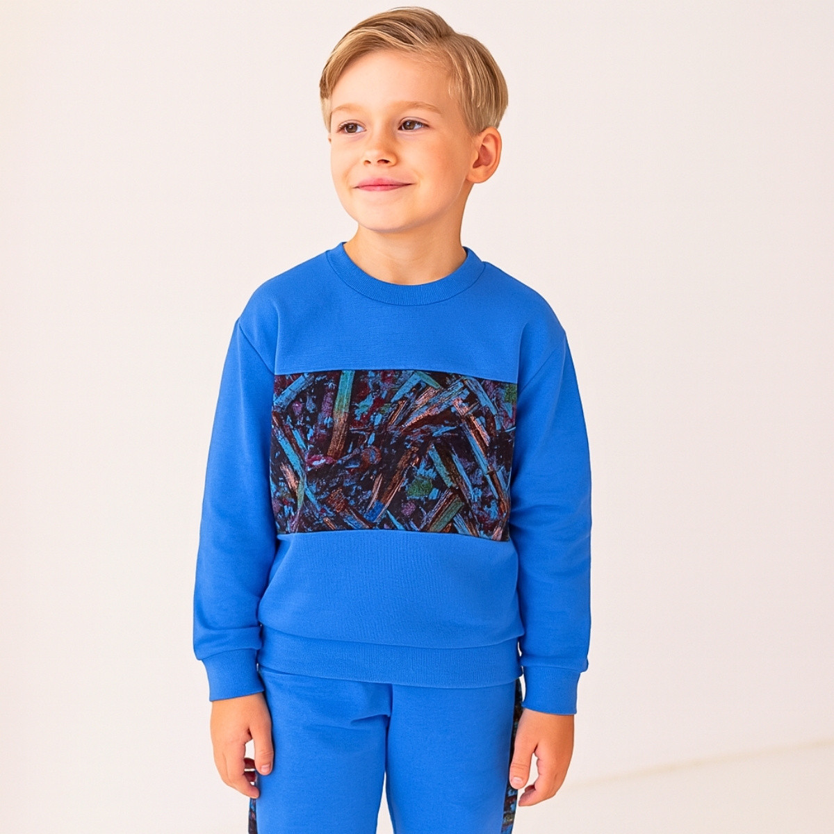 - Цвят: син, съчетан с цветни елементи отпред на блузата и кантове на крачолите.