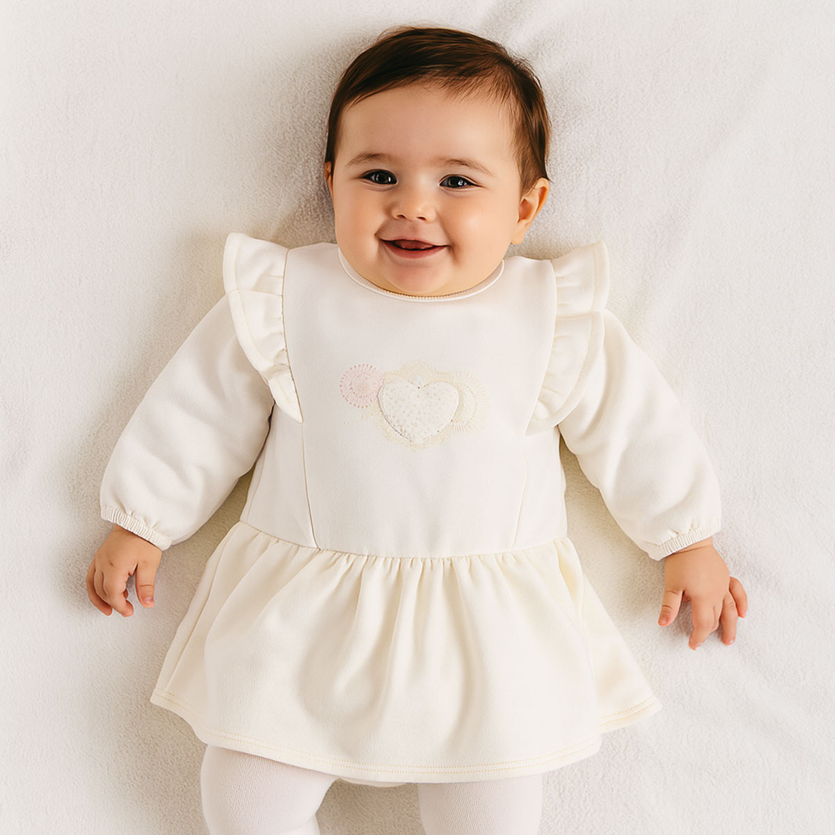 - Щампирана апликация отпред украсена с пришито плетено сърце и декоративни къдрички отпред.