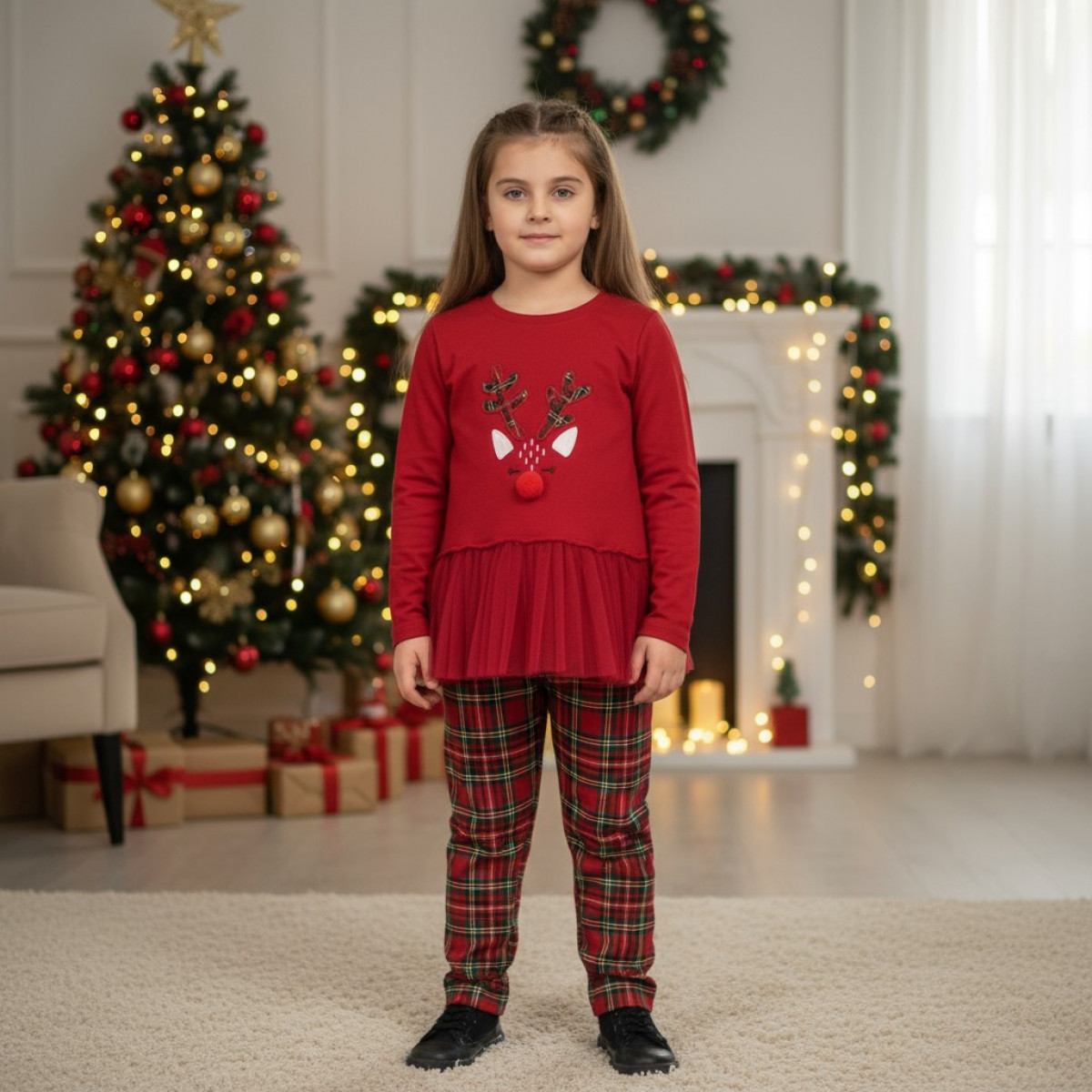 Коледен комплект с тюл в червено и каре