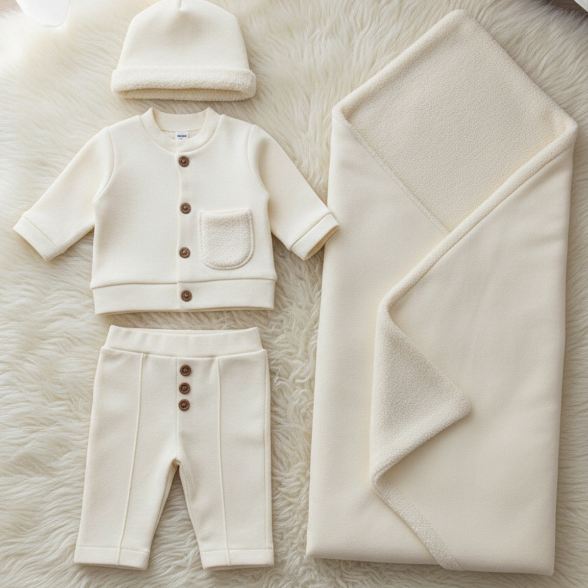 - Състои се от: жилетка, панталонче, шапка и пелена.