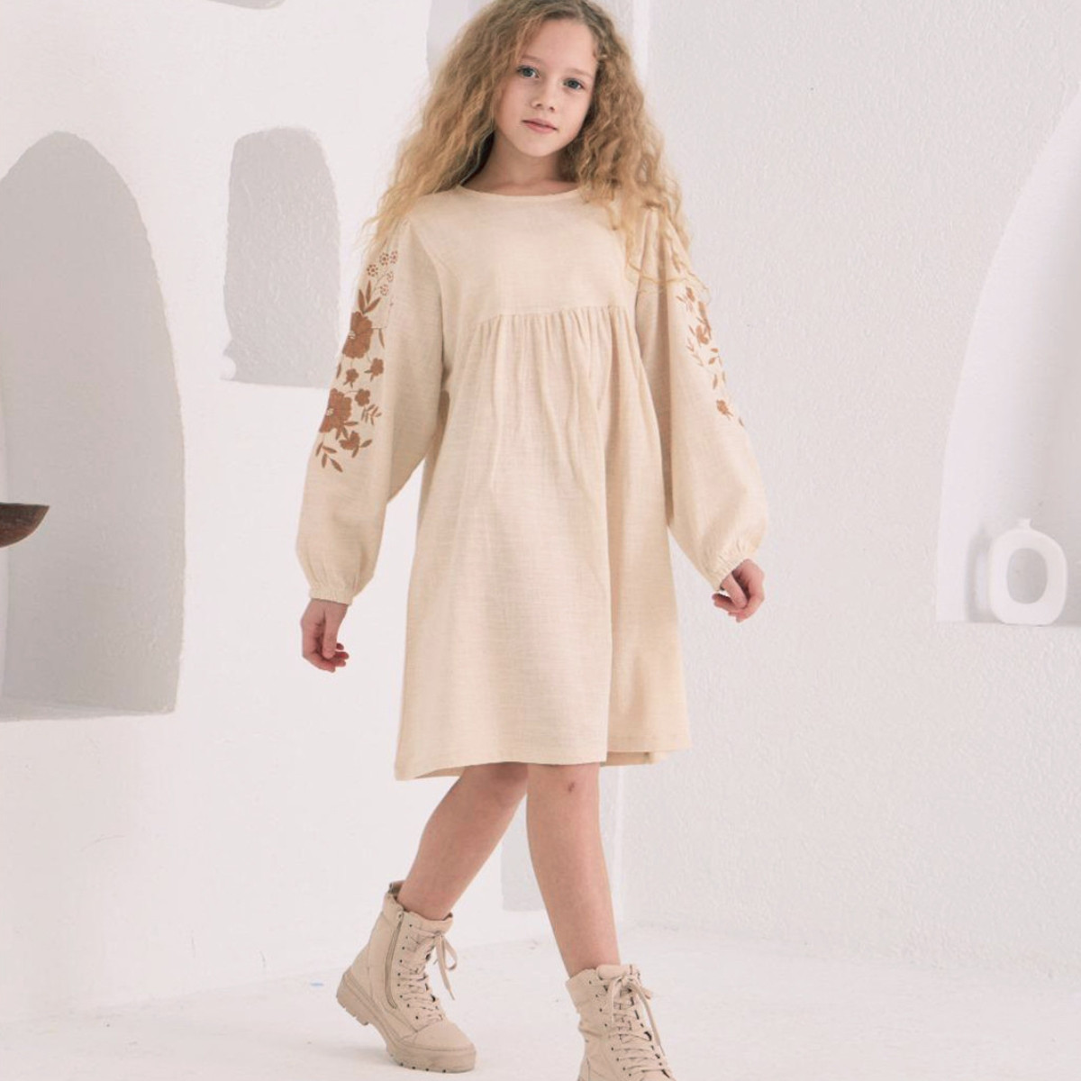 Детска памучна рокля с бродерия в бежово