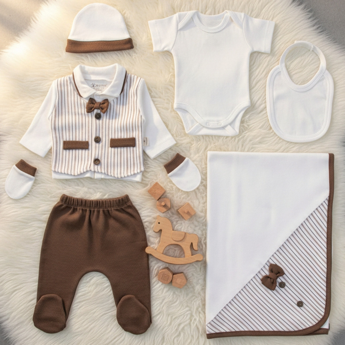 - Бебешки комплект за изписване на момченца в кафяво и бяло.