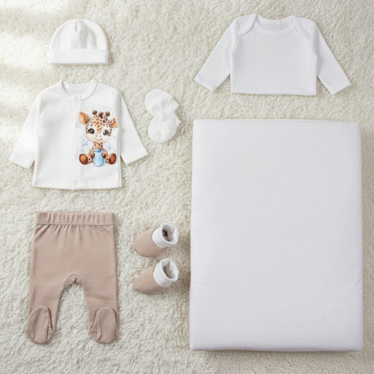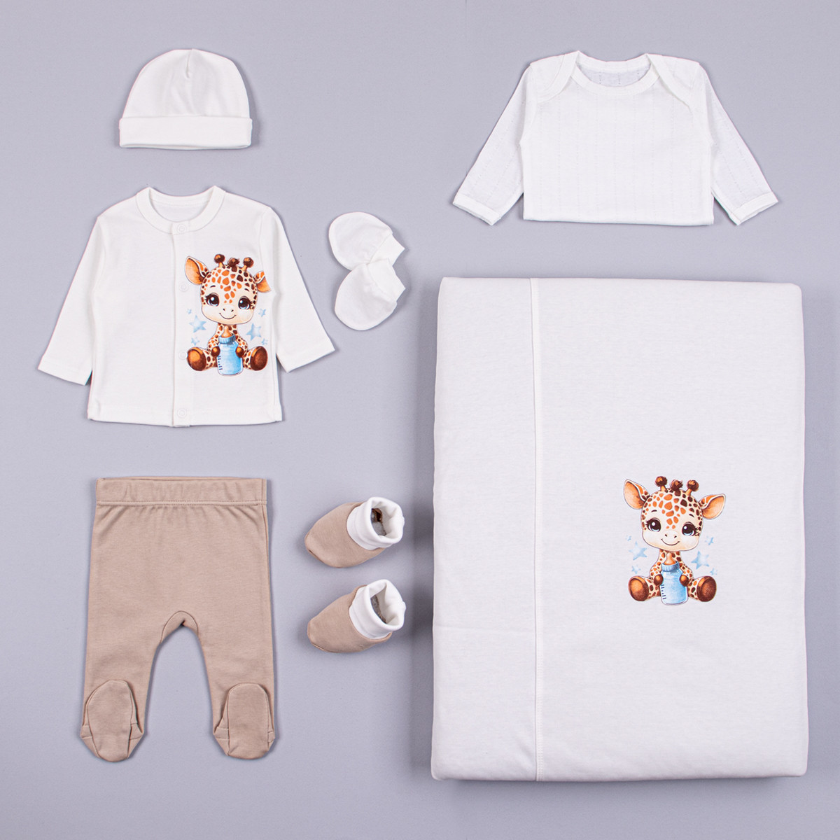 • Състои се от 7 части - Жилетка с картинка и закопчаване  по дължина отпред, боди с дълъг ръкав, ританки,терлички, ръкавички, шапка и пелена украсена с картинка.