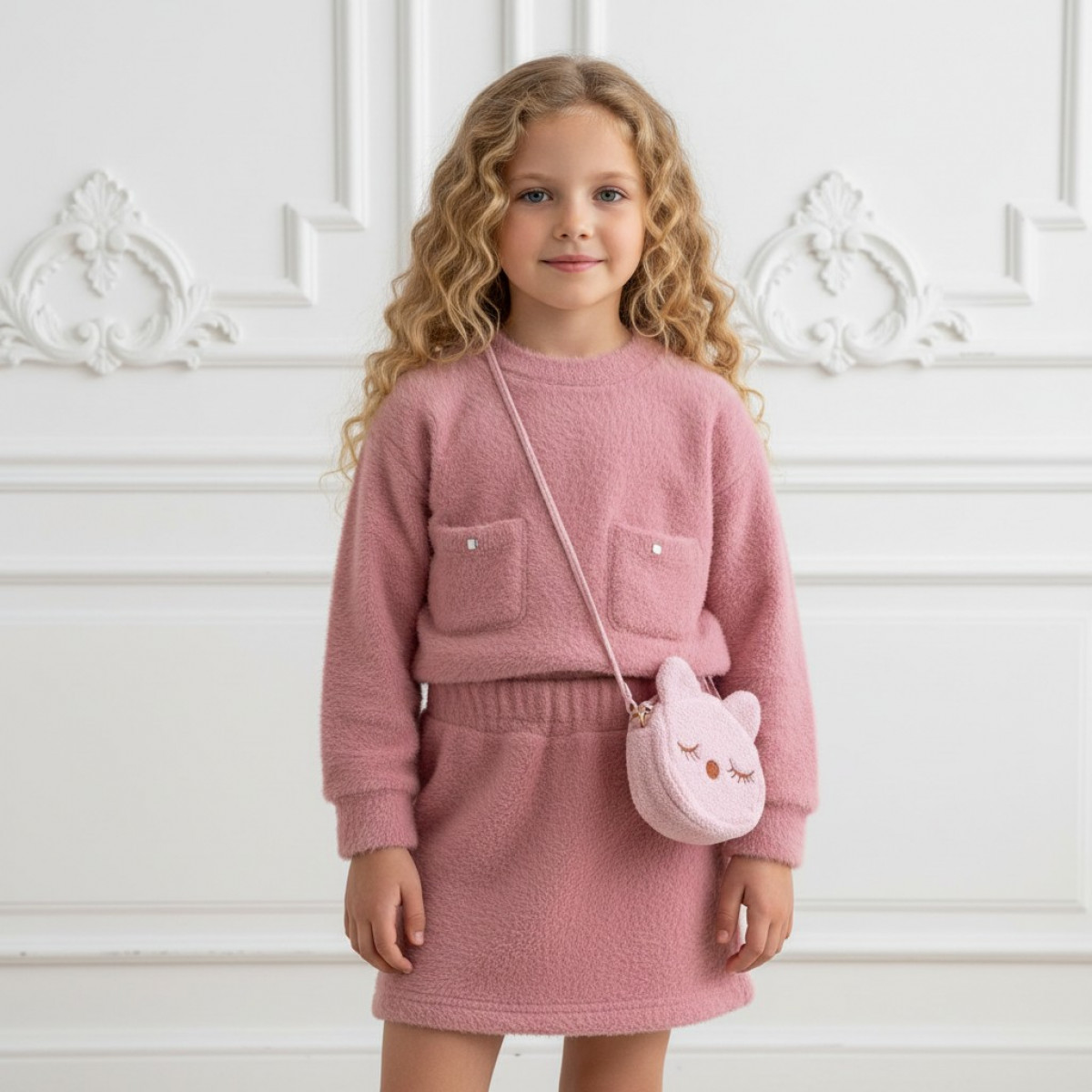 • Към комплекта има малка розова чантичка с бродирано личице.