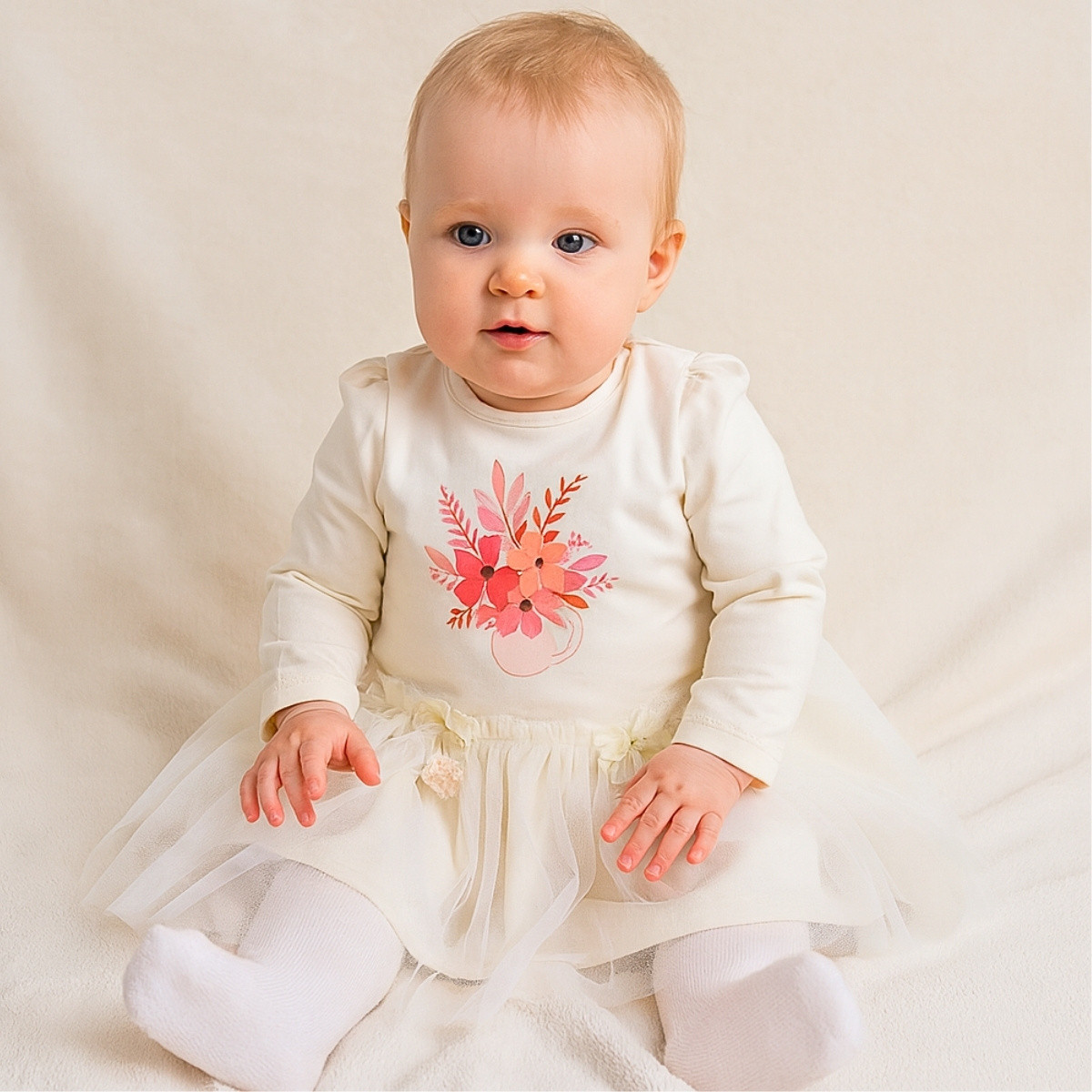 - Горната част е с щампирана картинка, а долната с пришит пласт нежен тюл.
