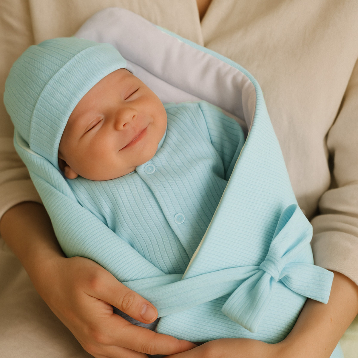 - Пелената има пришити дълги текстилни ленти, които позволяват удобно увиване и завързване в красива панделка.