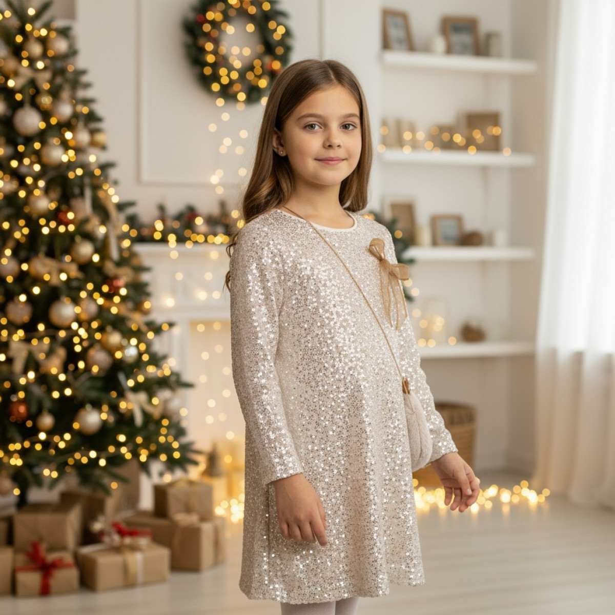 Официална рокля с бляскъв ефект и аксесоар