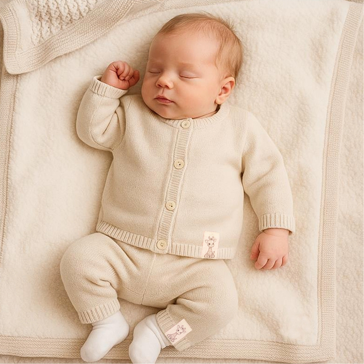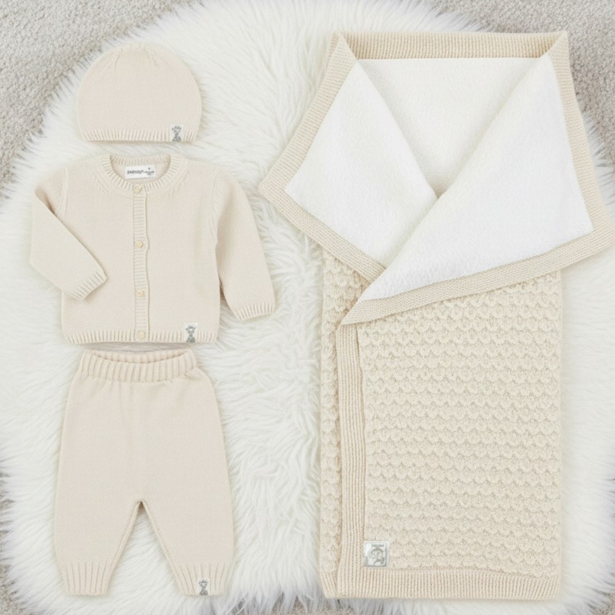 - Комплект за изписване от 4 части – жилетка, панталонче, шапка и плетено одеяло с пух.