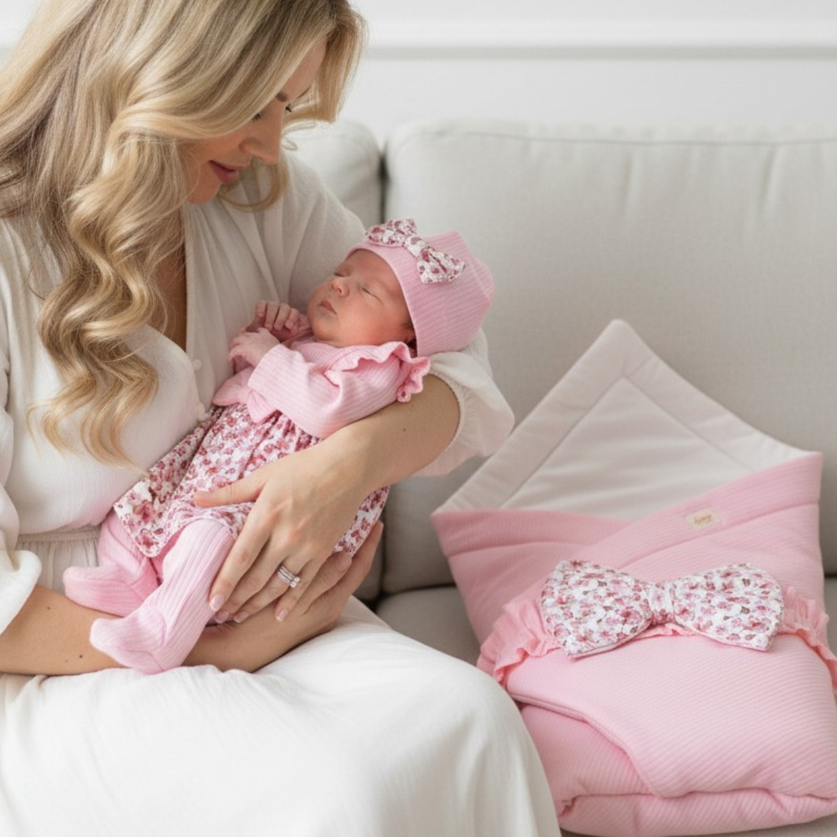Подарете на вашето новородено мекота, стил и уют с този нежен комплект за изписване в пастелни тонове и флорални акценти. Подходящ както за незабравимото прибиране у дома, така и за първата фотосесия.