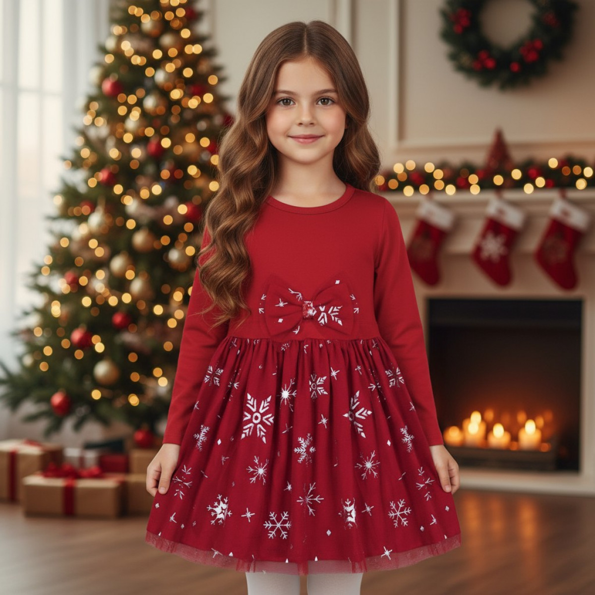 • От талията се спуска пласт нежен тюл, обсипан със снежинки.