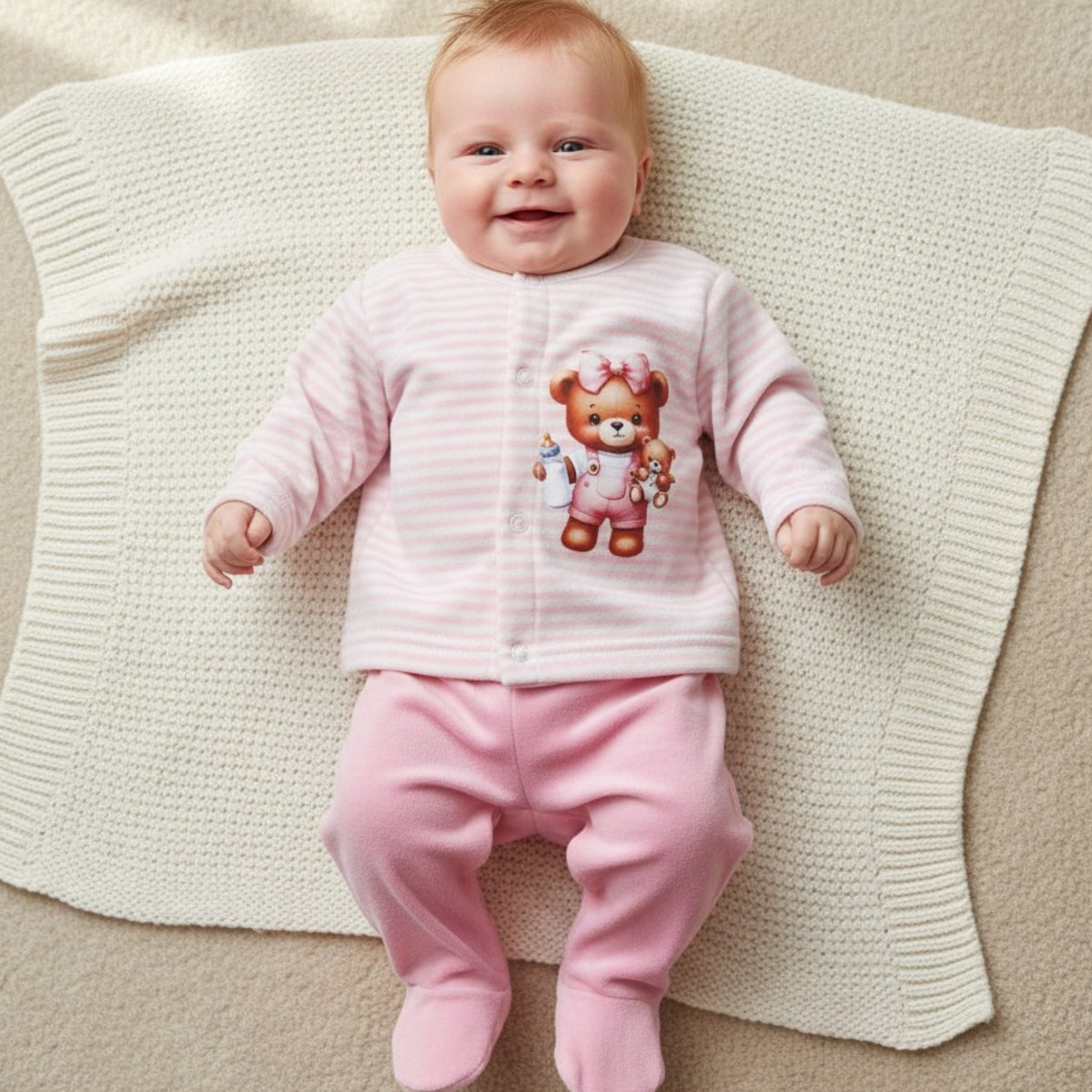 - Жилетката е в райе в розово и крем, украсена с щампирана картинка отпред.