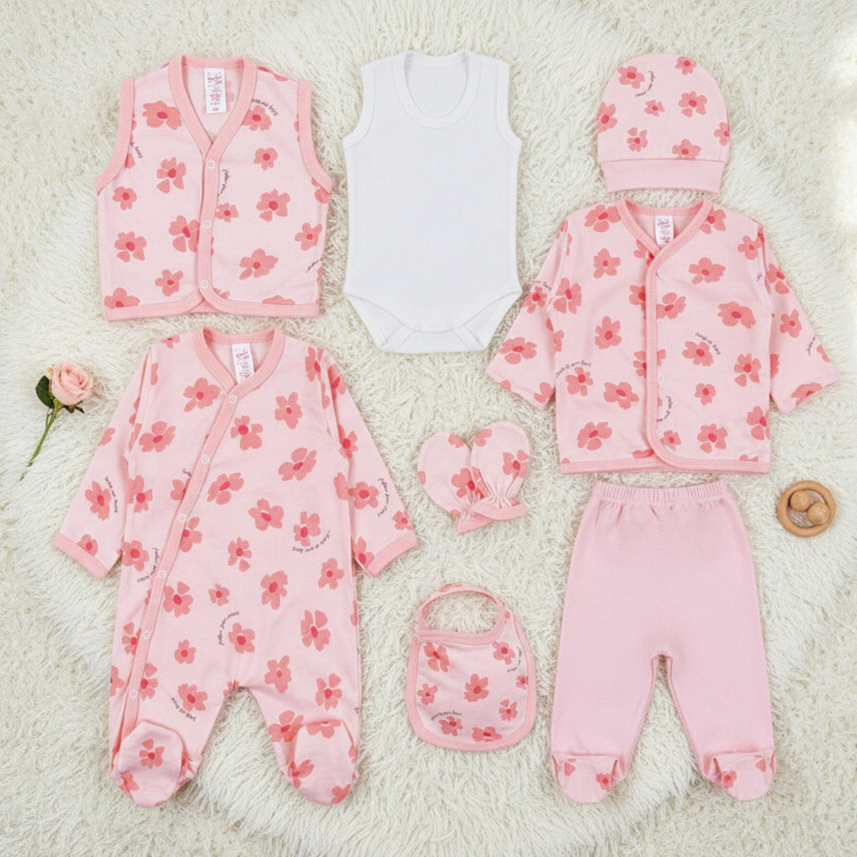 - Състои се от 8 части - ромпър, двупластова жилетка, ританки, елек, боди - потник, ръкавички, шапка и лигавник.
