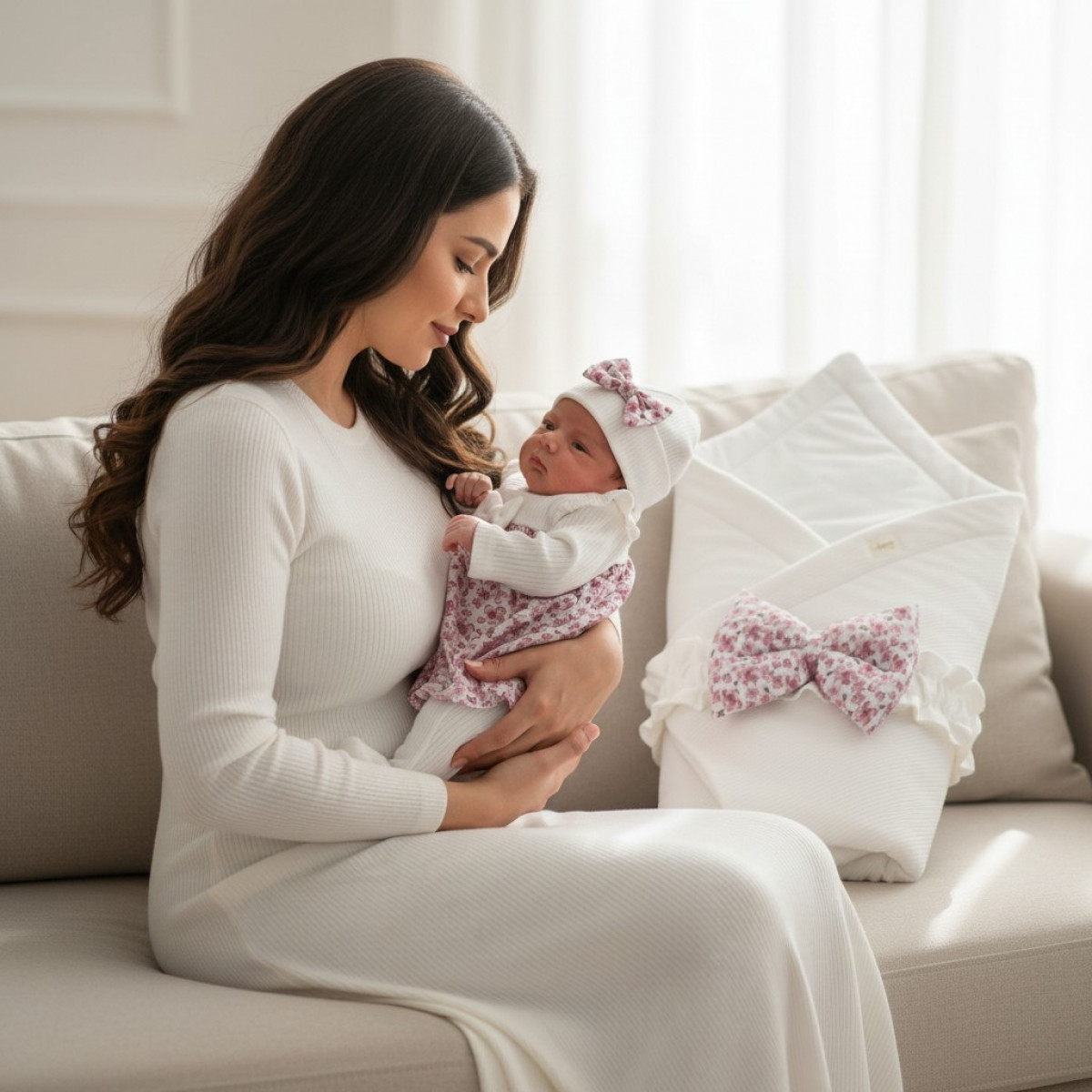 Този комплект съчетава стил, комфорт и нежна естетика – идеален избор за специалния ден на изписване или като изискан подарък за новородено!