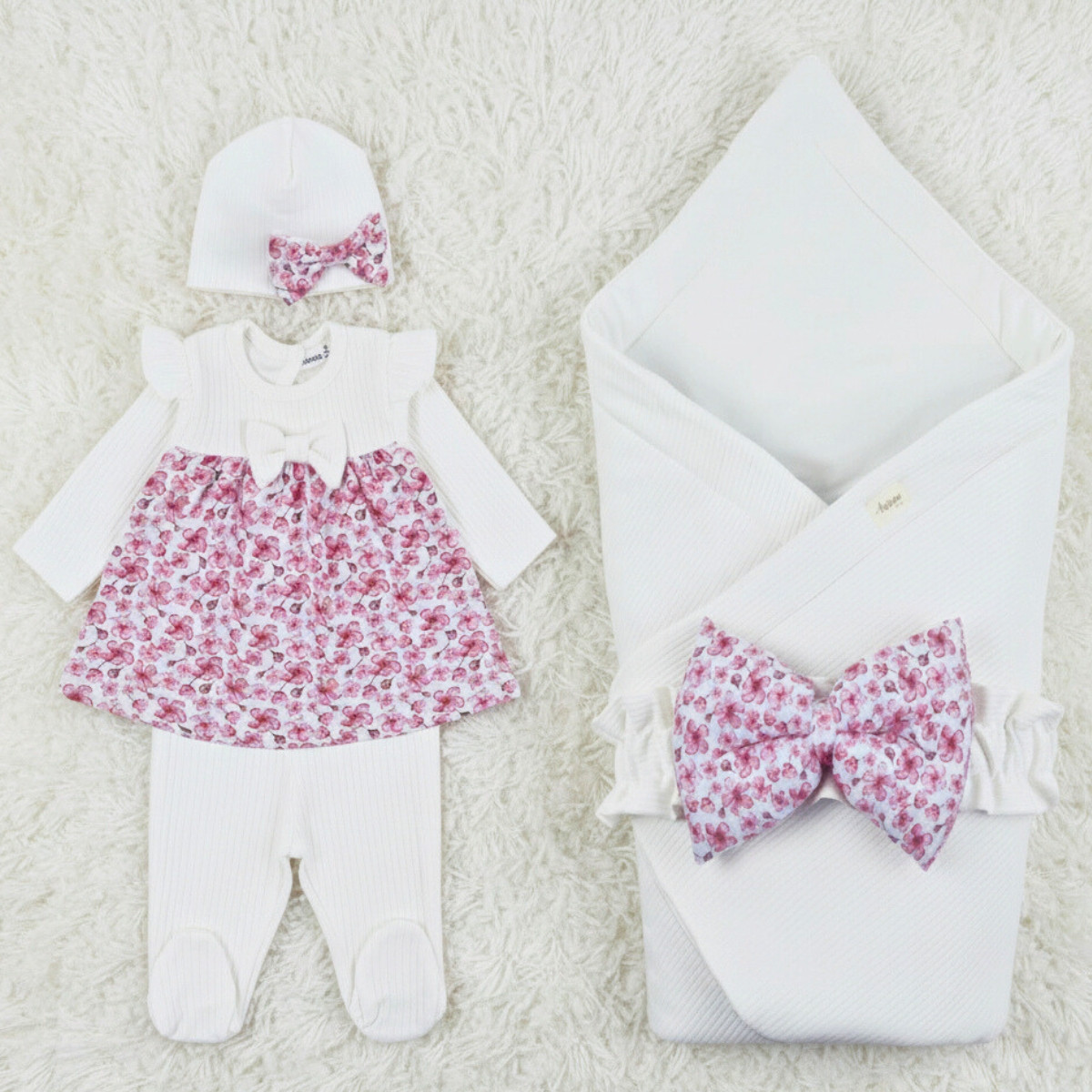 Подарете на вашето новородено мекота, стил и уют с този нежен комплект за изписване с флорални акценти. Подходящ както за незабравимото прибиране у дома, така и за първата фотосесия.