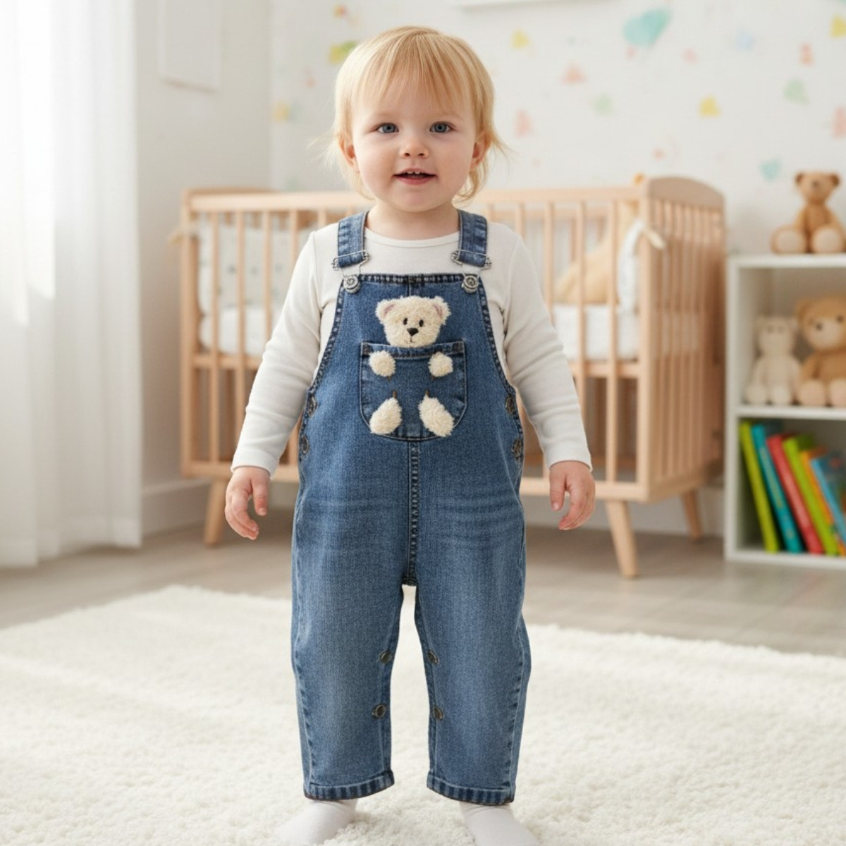 - Гащеризонът е в цвят деним с джоб отпред, в който е поставена плюшена играчка мече.