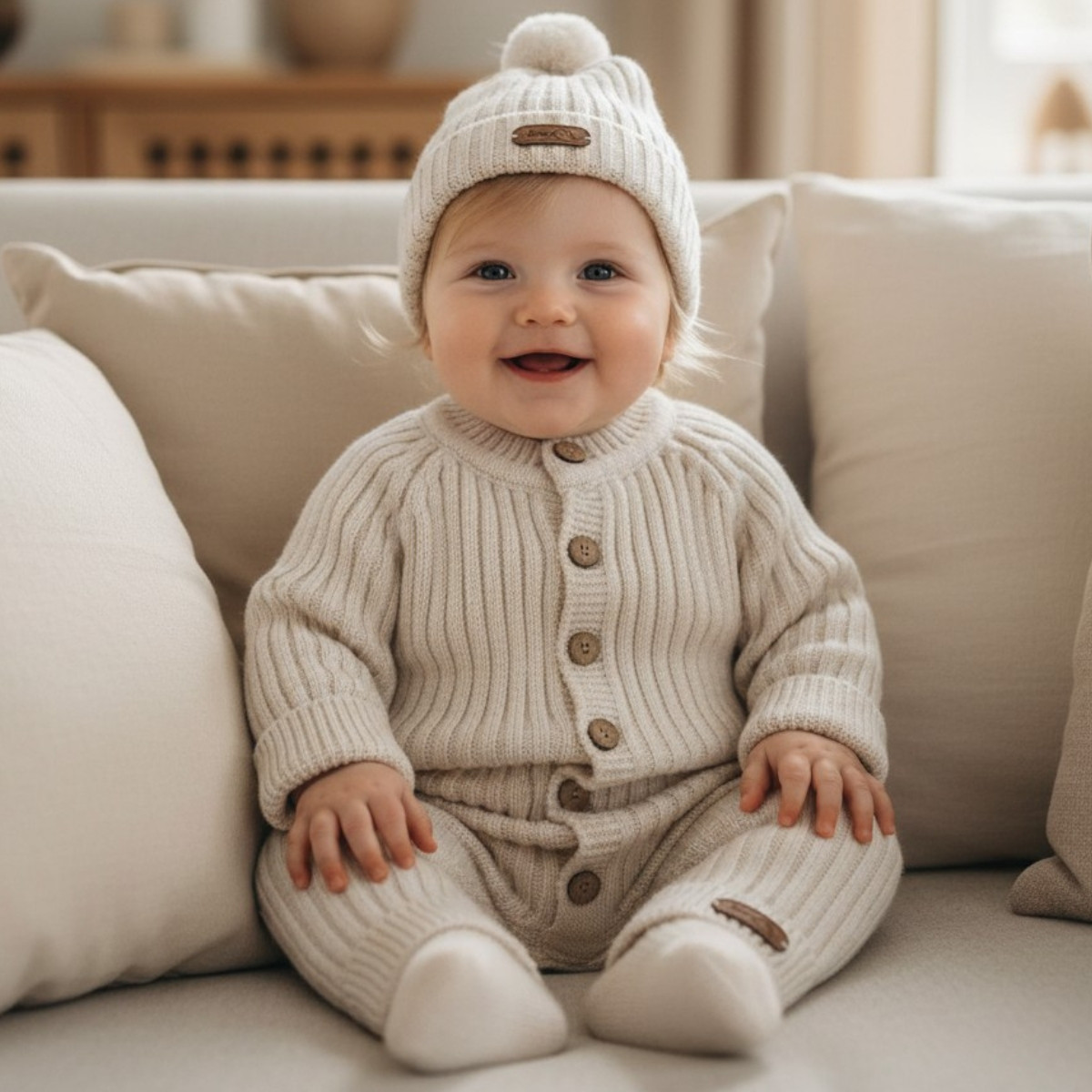 Бебешки ромпър от плетиво с шапка "Soft heat" в светлобежово