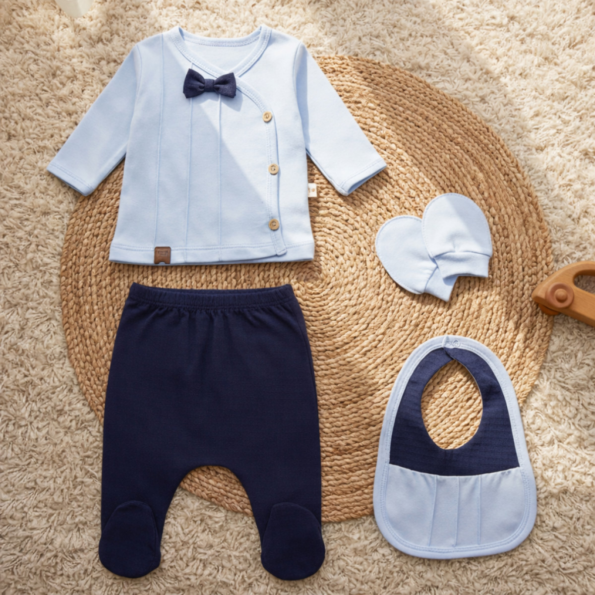 - Състои се от 4 части - жилетка, ританки, лигавник и ръкавички.