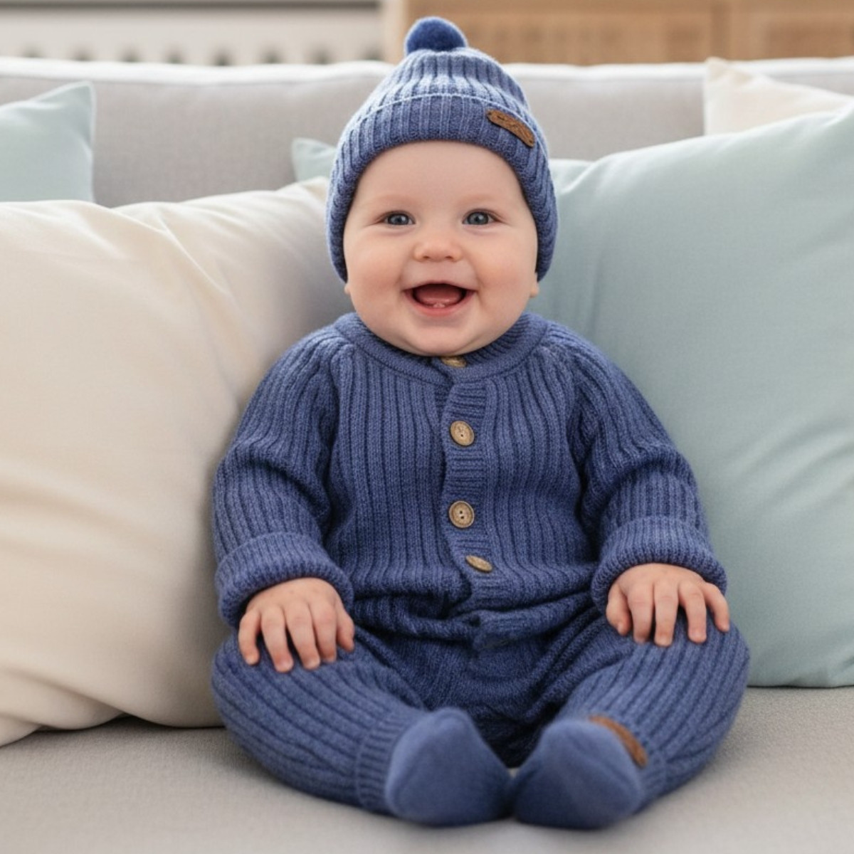 Бебешки ромпър от плетиво с шапка "Soft heat" в тъмносиньо