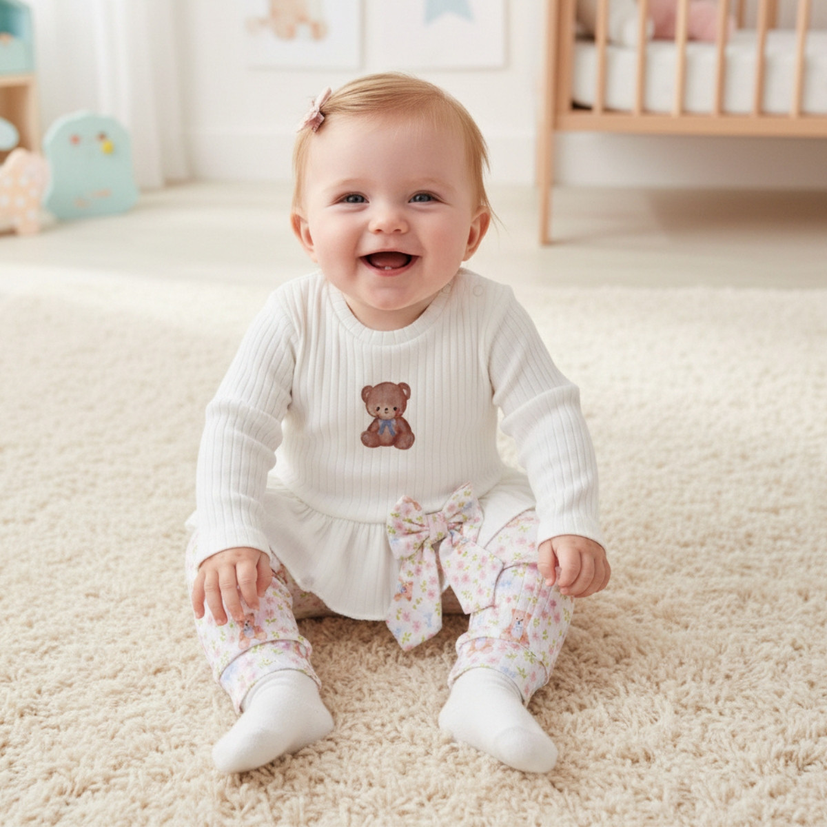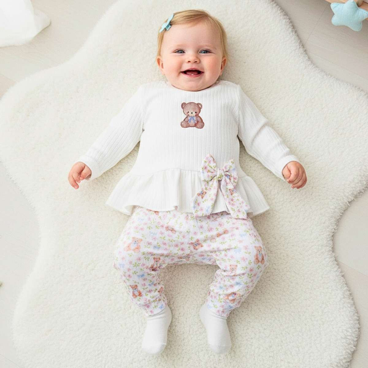 • Туниката е с къдрички в долната част и украсена с щампирано мече и панделка.