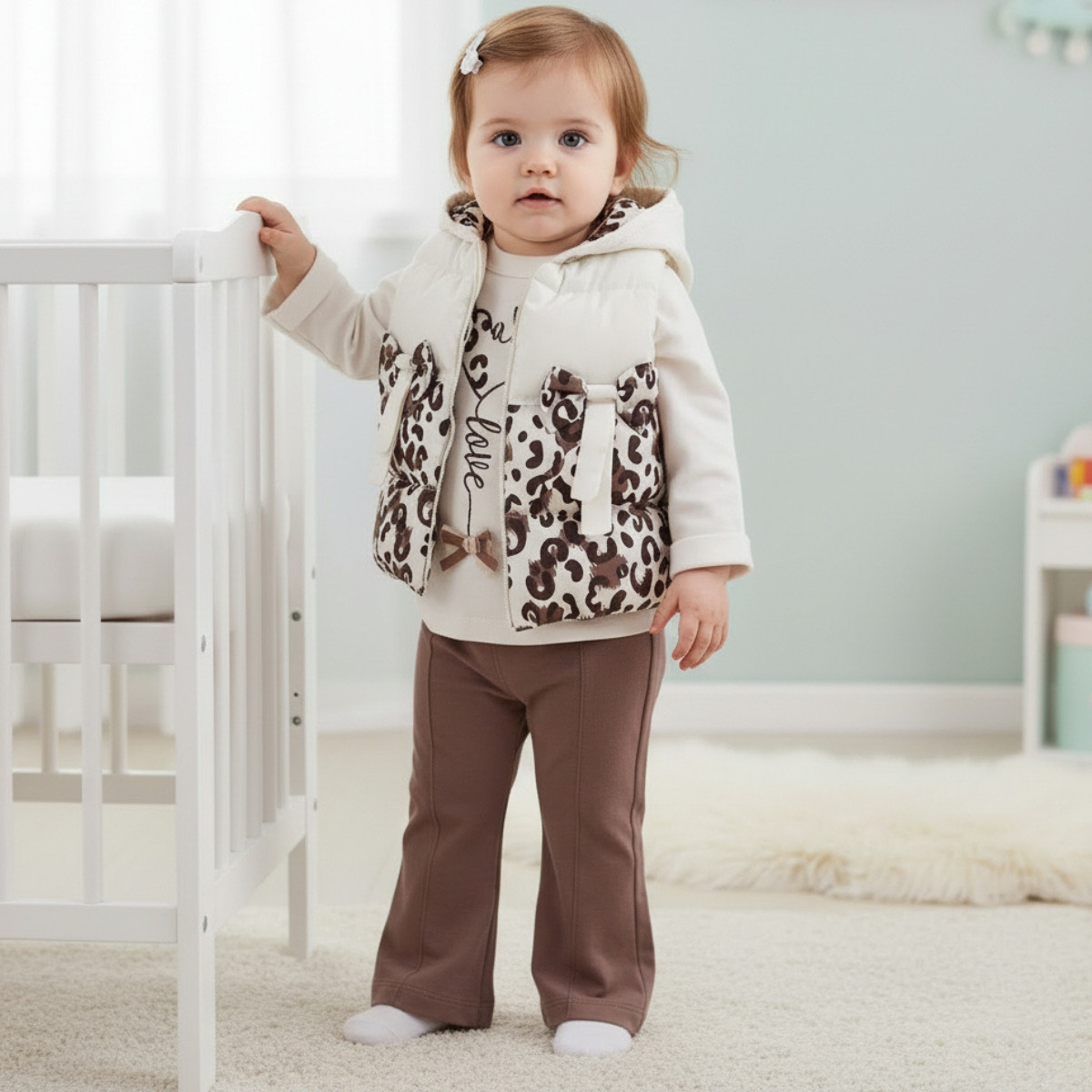- Капитонирано шушляково елече с памучен хастар в крем и леопардов принт, подплатено с топла вата.