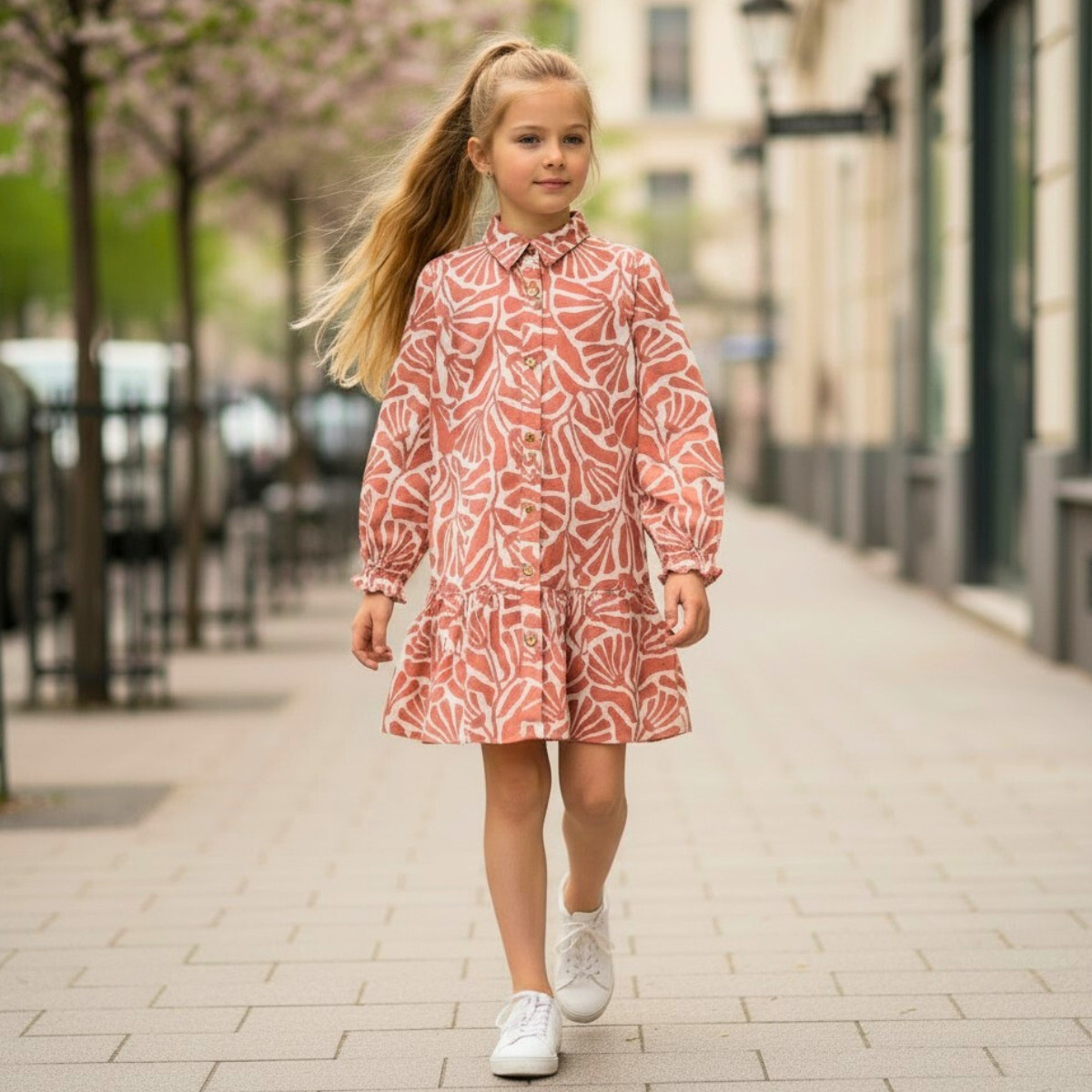 - Десенът е в опушен корал и екрю, с флорален мотив.